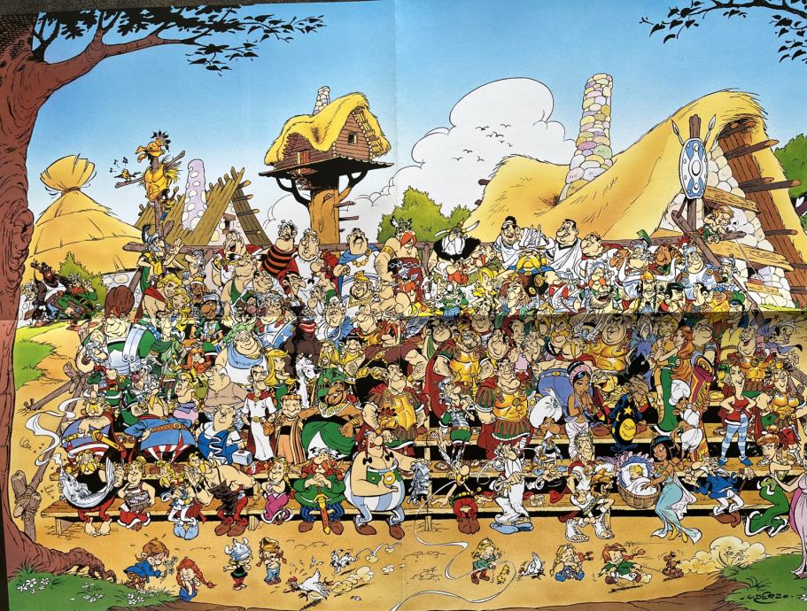 Bonus je potpuno očuvan i nikada rabljen poster Asterixa, Obelixa, galskog sela, rimskih legionara i brojnih drugih likova iz serijala dimenzija 39 x 52 cm.