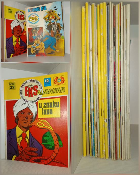 Prodajem kolekciju od 22 Eks Almanah stripa, raspon brojeva od 22 do 265. Stripovi su u različitom stanju očuvanosti – ima vrlo dobro očuvanih primjeraka, kao i nekoliko slabije očuvanih (vidljivo na fotografijama).