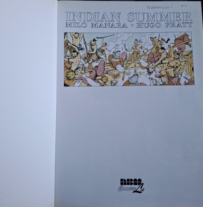 Prodajem strip Huga Pratt i Mila Manare INDIAN SUMMER na engleskom jeziku. Zabilješka na unutarnjoj naslovnoj stranici vidljiva na fotografiji.