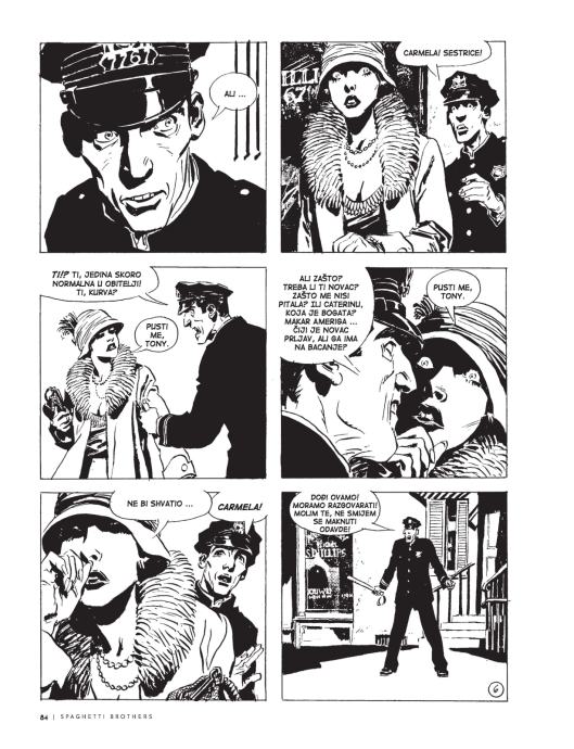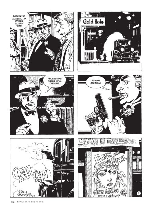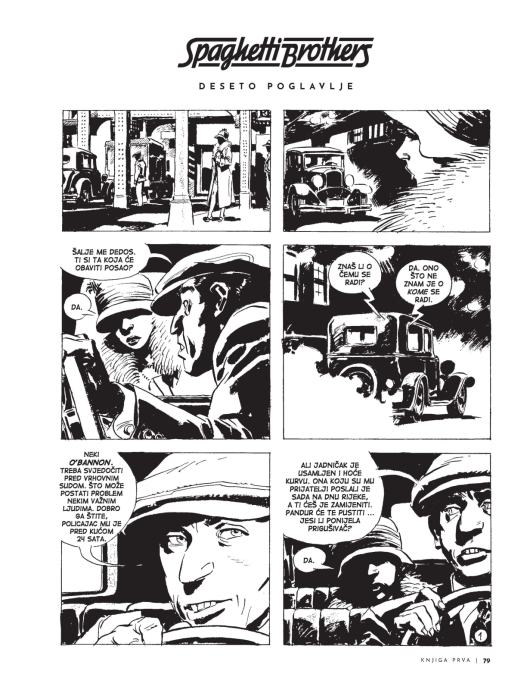 U Spaghetti Brothers, likovi koji nas uz sebe vežu na prvi pogled na idućoj će stranici počiniti gore stvari od onih koje smatramo zločincima; zločinci će nam se smiliti kad dođe njihov red da pate. Ispod Mandrafininih divnih crno-bijelih crteža ništa nije crno-bijelo: svaki je Trillov lik sposoban i za dobro i za zlo, često u istome dahu, i svaki je tako neraskidivo vezan za vlak vlastite sudbine na tračnicama tragedije.