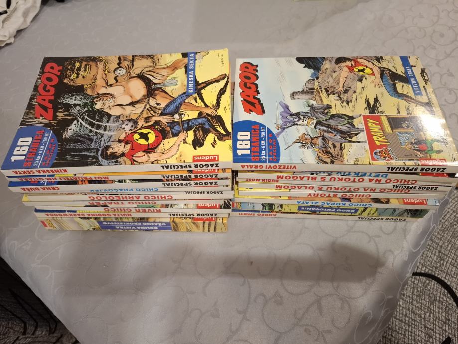 Prodajem stripove : - Zagor br.1- br 121,cijena kompleta 350 eura. - Zagor extra br.1-br.122, cijena kompleta 360 eura(u kompletu nedostaje br.119), - Zagor specijal razni 19 stripova,cijena kompleta 65 eura, -Mr No br.1 - br.32, cijena kompleta 90 eura. Stripovi su odlično očuvani. STRIPOVE PRODAJEM ISKLJUČIVO U KOMPLETIMA, NE NA KOMADE! Javiti se za dogovor možete na mail stankopot@gmail.com