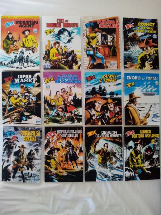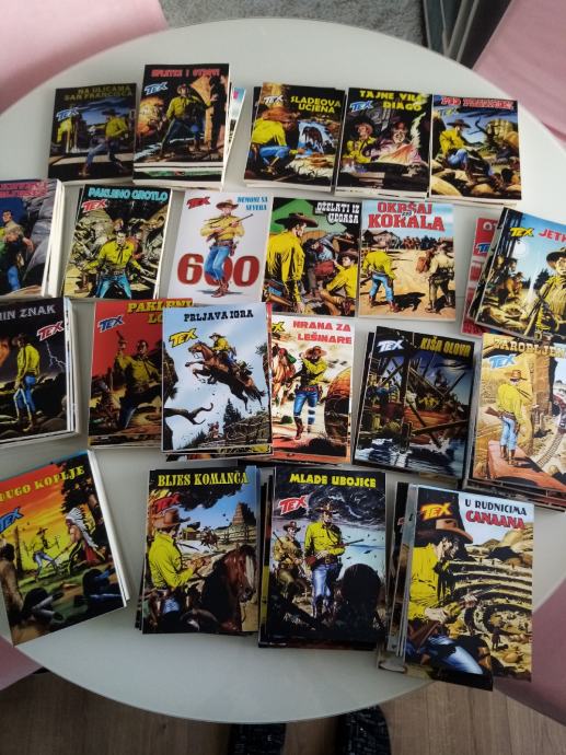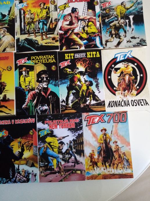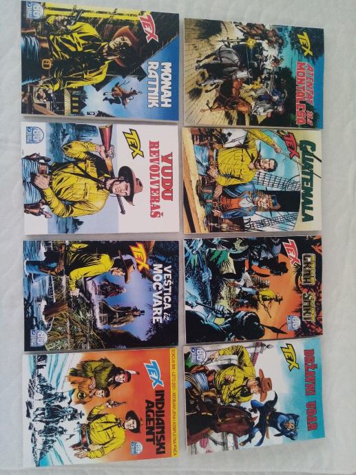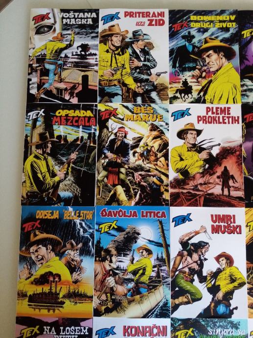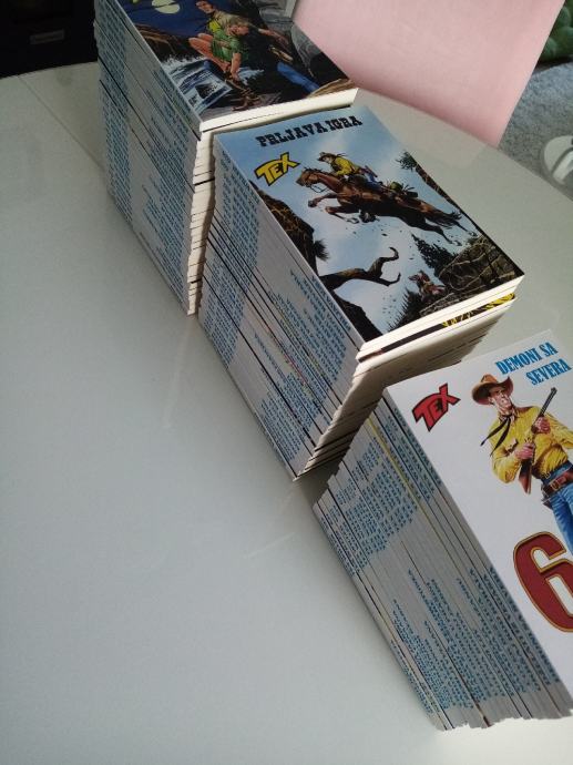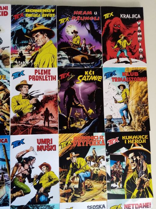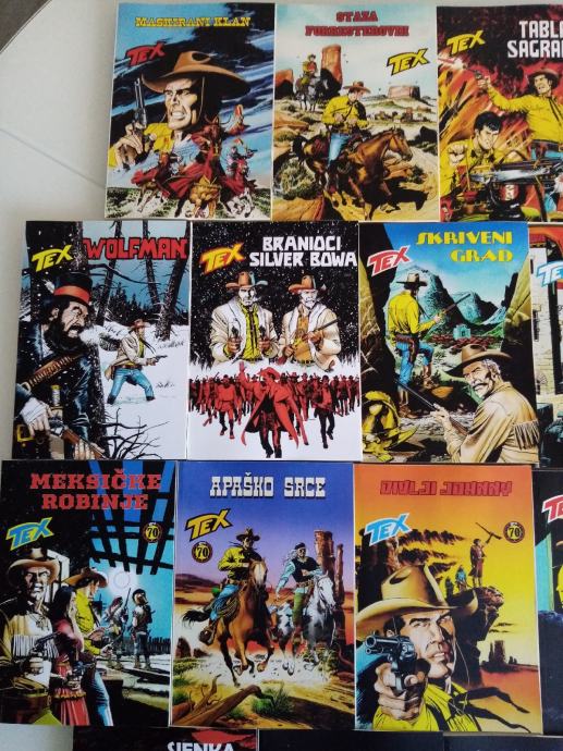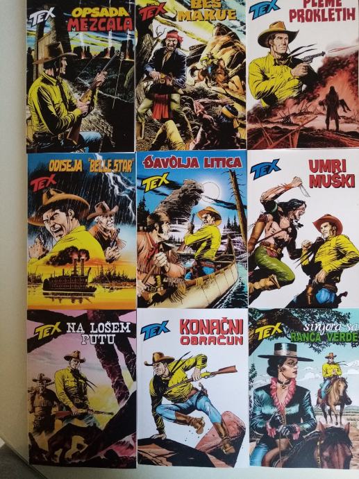 Tex Willer preveden i napravljen po uzorku na talijanska izdanja. Dostupni brojevi od 631 do 779, plus 729bis, 741bis, 753bis, 765bis i 777bis po originalnoj talijanskoj numeraciji. Cijena 4.5 eura komad, kolorci (695, 700) 8 eura, a broj 755 - Jahanje sa sudbinom (132 stranice u boji) 10 eura. Zvati ili poslati poruku (viber, whats, njuškalo) na 095 538 2245.