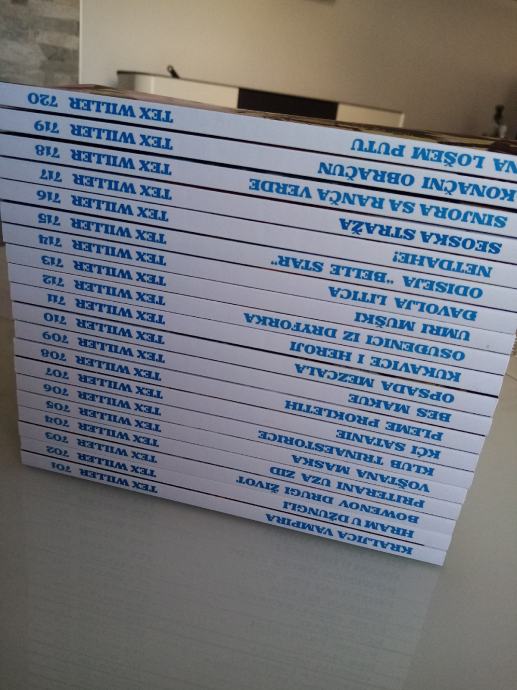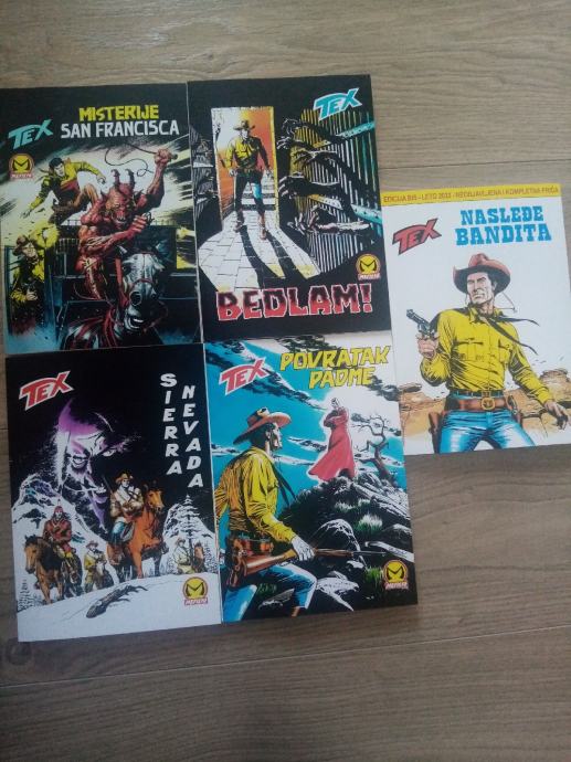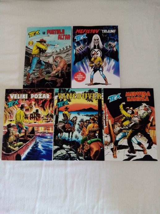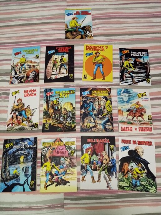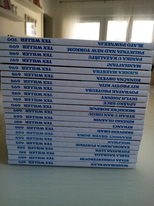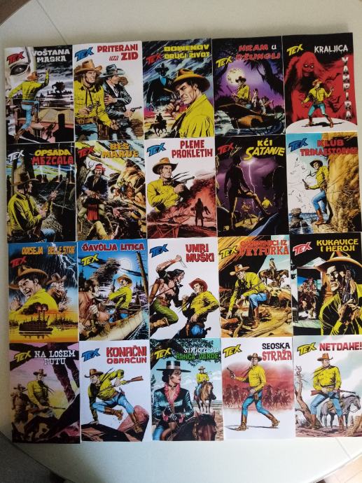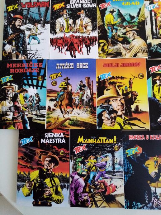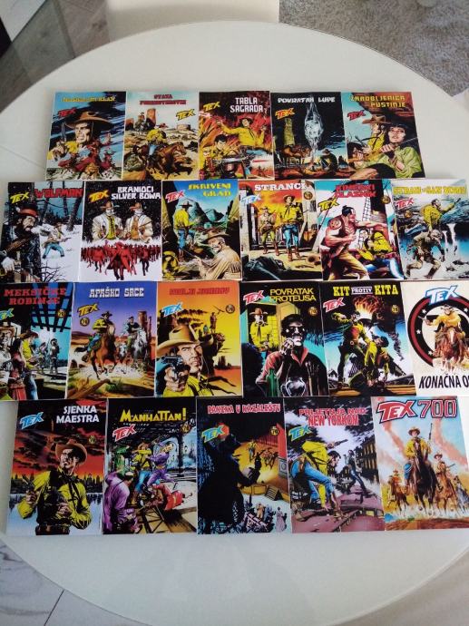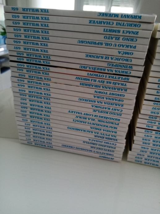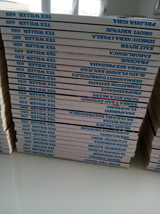 Tex Willer preveden i napravljen po uzorku na talijanska izdanja. Dostupni brojevi od 631 do 779, plus 729bis, 741bis, 753bis, 765bis i 777bis po originalnoj talijanskoj numeraciji. Cijena 4.5 eura komad, kolorci (695, 700) 8 eura, a broj 755 - Jahanje sa sudbinom (132 stranice u boji) 10 eura. Zvati ili poslati poruku (viber, whats, njuškalo) na 095 538 2245.