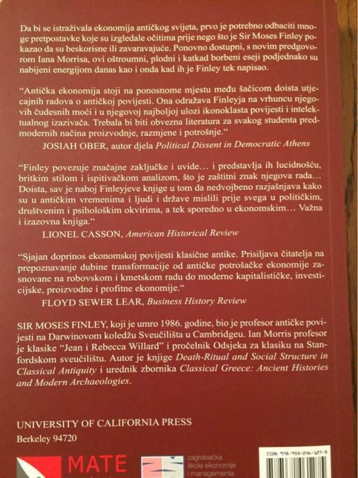 Da bi se istraživala ekonomija antičkog svijeta, prvo je potrebno odbaciti mnoge pretpostavke koje su izgledale očitima prije nego što je Sir Moses Finley pokazao da su beskorisne ili zavaravajuće. Ponovno dostupni, s novim predgovorom Iana Morrisa, ovi oštroumni, plodni i katkad borbeni eseji podjednako su nabijeni energijom danas kao i onda kad ih je Finley tek napisao.