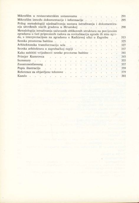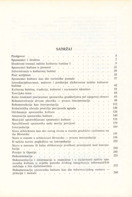 Ovo je treća u nizu knjiga o zaštiti kulturne baštine koju izdaje Društvo konzervatora Hrvatske. Ona se bavi suvremenim, društvenim i teorijskim odnosima prema baštini, naglašavajući probleme zaštite, očuvanja, dokumentacije i prezentacije spomenika kulture. Knjiga je bogato ilustrirana izborom suvremenih primjera iz zemlje i svijeta koji su popraćeni tekstualnim analizama.