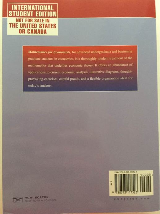 Mathematics for Economists, a new text for advanced undergraduate and beginning graduate students in economics, is a thoroughly modern treatment of the mathematics that underlies economic theory.