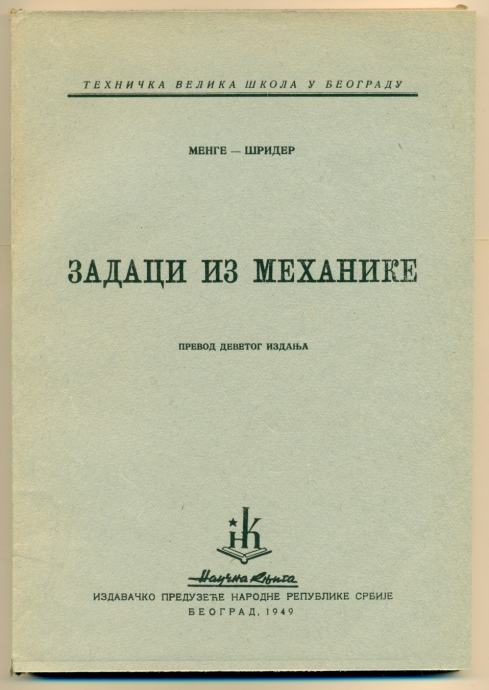 4. ZADACI IZ MEHANIKE - Kinematika - Dinamika - Hidromehanika, ćirilica (Menge - Šrider), prijevod s njemačkog jezika, Naučna knjiga Beograd, 1949., str. 215 +VIII, meki uvez, 5,50 € / 41,44 kn, prodajem (može i pojedinačno).