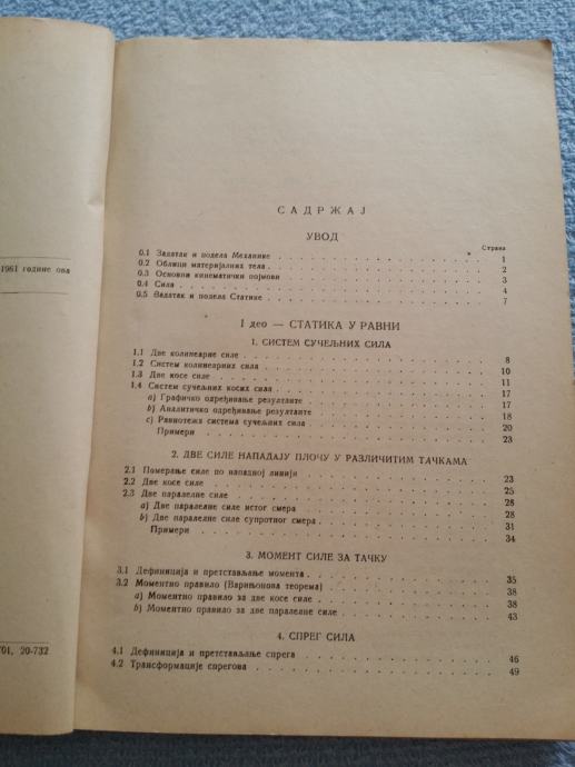 1. MEHANIKA I deo (Statika) za prvi stepen studija na Mašinskim fakultetima, ćirilica (Dr D. Rašković), Građevinska knjiga Beograd, 1967. (drugo dopunjeno izdanje), str. 204 + VIII, meki uvez, 5,00 € / 37,67 kn