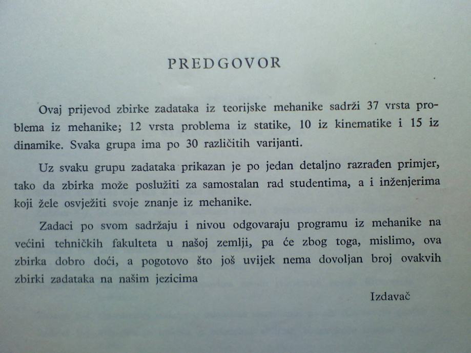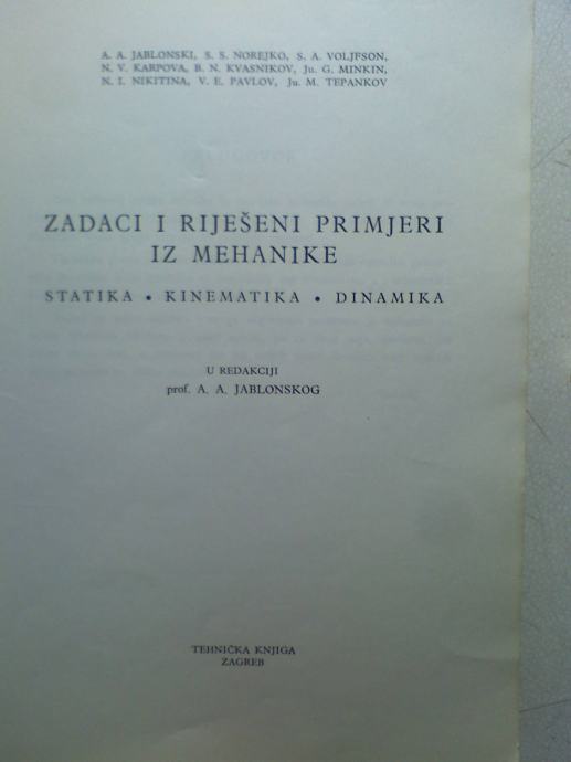 Zadaci i riješeni primjeri iz mehanike, Statika - Kinematika - Dinamika, prijevod s ruskog jezika (Jablonski), Tehnička knjiga Zagreb, 1972, str. 292, meki uvez, 10,00 € / 75,34 kn, prodajem.
