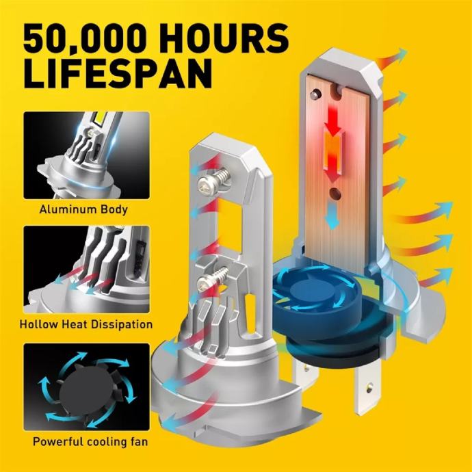 Sigurno ste već kupili neki H7 bez ventilatora, Ne želimo svijetlu LED žarulju prednjeg svjetla koju treba često mijenjati. Što je svjetlost jača, proizvodi više topline, pa joj je život kraći. AUXITO H7 LED žarulje za prednja svjetla ugrađene su u ventilator za hlađenje velike brzine od 12.000 RPM i bakrenu osnovnu ploču koja učinkovito odvodi toplinu od LED čipova, osiguravajući više od 50.000 sati neprekidnog osvjetljenja.