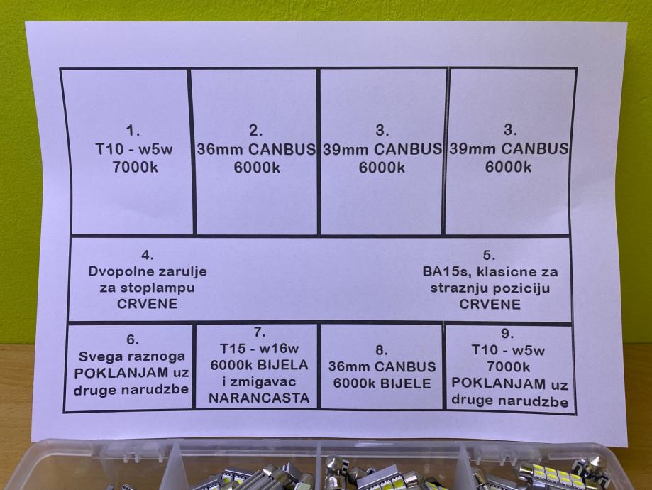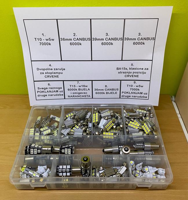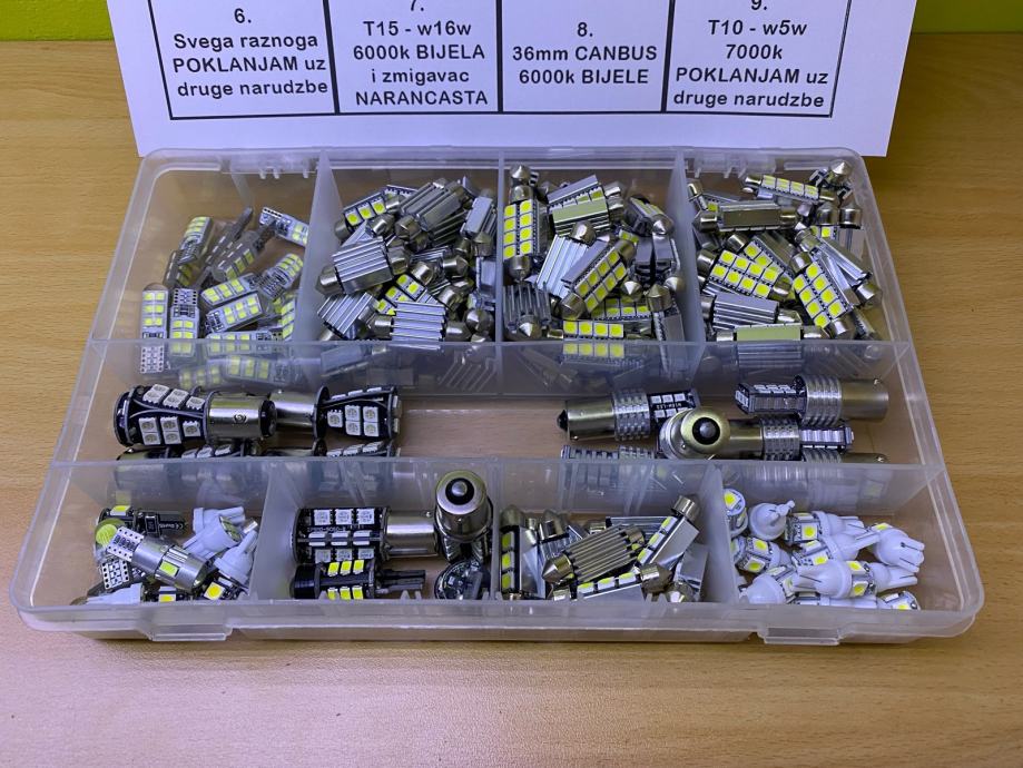 - PRODAJE SE KOMPLETNA KUTIJA SA 150 KOMADA LED ŽARULJA NAMJENJENIH ZA UGRADNJU U AUTE. SET SE SASTOJI OD 95% MODELA ZA SVAKI TIP VOZILA, A KOMPAKTIBILNOST OVISI OD MARKE DO MARKE VOZILA.