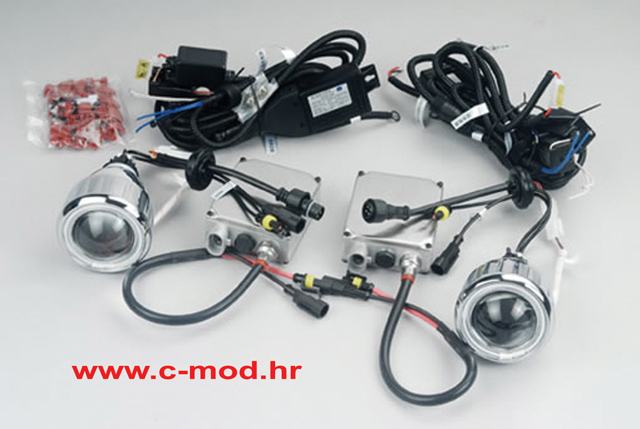 Montaža bez bušenja ili ljepljenja. U kompletu se nalaze: 2 projektorske leće sa zaklopkom (dugo/kratko svijetlo) i sav potreban pribor za montažu. Za rad su potrebni još žarulje i balasti. Uz ugradnju CANBUS balasta moguće montirati i na vozila novije generacije (BMW, Audi, Mercedes, VW...)
