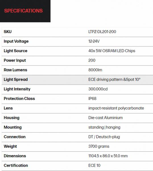 The LTPRTZ 200W LED Daylight Lightbar consists of 40 x 5W OSRAM LEDs. This light has an ECE driving pattern and a 10° Spot area and draws 12-24V with a die-cast aluminium housing.