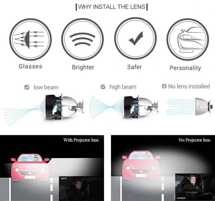 Leće projiciraju dugo i kratko svjetlo. U leće se može staviti obična halogena, xenon ili LED žarulja. Također se mogu ugraditi u sve aute koji veći imaju tvorničke leće uz određene preinake.