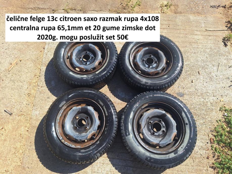 prodajem celicne felge 13 coli bile na citroen saxo razmak rupa 4x108 centralna rupa 65,1mm et 20 5 jota na felgama zimske gume dot 2020god. ripne dobre mogu posluzit cijena seta 50 eura fixno neprodajem pojedinacno samo komplet