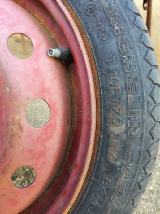 Guma na felgi Michelin Tex T 105/70R14 84M spucala je nije bog zna što ima ripnu ali spucala od starosti , zrak drži ali bilo bi dobro zamjeniti ju ...