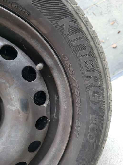 Prodajem set kotača s VW Up! Čelične felge, original prva ugradnja. Na felgama montirane ljetne Hankook Kinergy Evo gume 165/70R14. Uz to idu i 4 zimske gume Michelin Alpin 4. Gume starije ali sve ispravno i skinuto s automobila koji se koristio. Prodaje se samo u kompletu. Cijena za sve fiksna 200 eura. Bez zamjena.