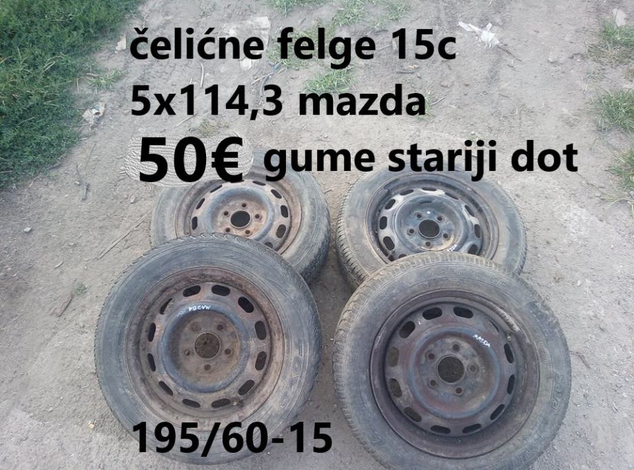 prodajem celicne felge za mazdu 5x114,3 15 coli felge ravne netresu gore gume 195/60-15 stariji dot 2015g. ripne 3-4mm za nuzdu mogu posluzit za ljeto njih poklanjam uz felge ili ako vam netrebaju mogu ih skinut o svom trosku cijena komplet 50€