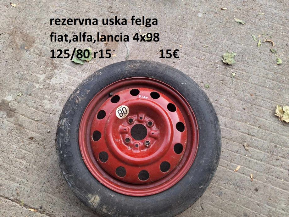 prodajem rezervnu usku felgu za fiat,alfa i lancia vozila 4x98 razmak rupa 15 coli 125/80 r15 guma dobra ko i felga cijena 15 eura fixno