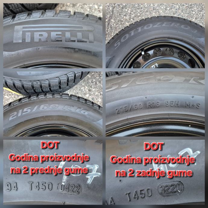 Celicne felge 16 5x112 Skoda Yeti Superb Karoq sa gumama 215/60R16 95H M+S Zimske Pirelli Sottozero Winter 3 / dubina sare na sve 4 gume 7 mm, na 2 prednje gume DOT0422 - 4 sedmica 2022 godine , na 2 zadnje gume DOT3220 - 32 sedmica 2020 godine