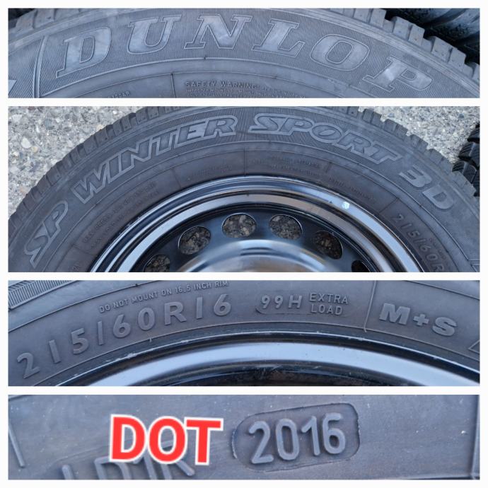Na felgama imaju gume 215/60R16 99H M+S Zimske Dunlop Winter Sport 3D DOT2016 (20 sedmica 2016 godine ) Dubina sare na 2 prednje gume 7 mm, na druge 2 zadnje gume dubina sare 5 mm