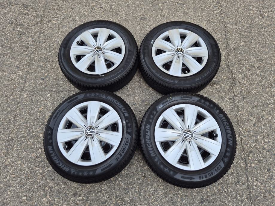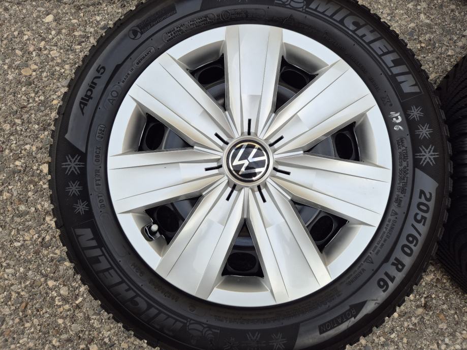Celicne felge 16 5x112 VW T-Roc Caddy Touran Passat B6 B7 CC sa ratkapama i zimskim gumama 205/60R16 92H Michelin Alpin A5 / DOT0321 - 03 sedmica 2021 godine / na 2 prednje gume dubina sare 8 mm, na 2 zadnje gume dubina sare 7 mm