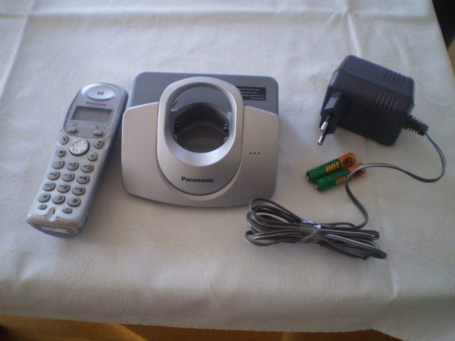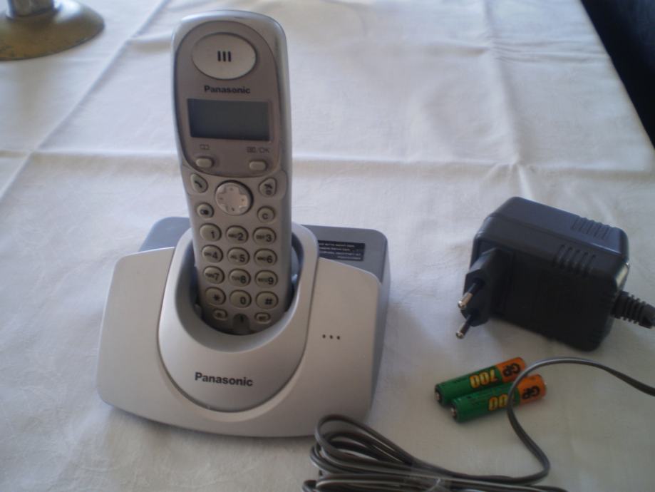 Očuvan bežični telefon Panasonic, srebrne boje, adapter 220 V i punjive baterije.