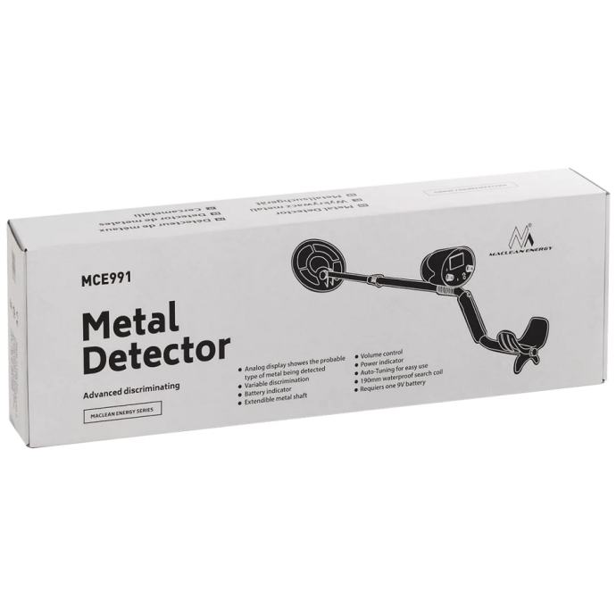 Vrlo korisna naprava za svakog lovca na metalne predmete. Omogućuje otkrivanje malih metalnih kovanica i čeličnih greda u podu ili zidovima. Točnost osigurava analogni indikator visoke osjetljivosti. Detektor MCE991 ima podesivu duljinu kraka sonde. Rezultati mjerenja prikazuju se na čitljivom LCD indikatoru i oglašava se zvučni signal. Kako ne biste privlačili nepotrebnu pozornost, jednostavno uključite slušalice u 3,5 mm utičnicu. Detektor ima unutarnju kontrolu glasnoće zvučnika i također ulaz za slušalice. Zahvaljujući dobrom balansu sprave i udobnom držanju ispod ramena, rad kandidata postaje još ugodniji. Dubina pretrage (približno): - Mali predmeti, na primjer novčići:.. 10 cm - Mali predmeti, na primjer oružje do 25 cm - Veliki predmeti, na primjer viteški oklop: do 40 cm - Vrlo veliki predmeti, na primjer tenkovi :. do 120 cm.