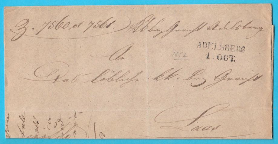 Staro originalno pismo (predfilatelija) putovalo davne 1852. godine iz Postojne (Adelsberg) u Laas (Lož - Stari trg pri Ložu, Slovenia).