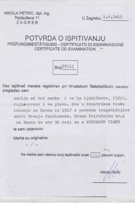 ATEST NIKOLE PETRICA BOSNA 1917 POKUSNI TISAK