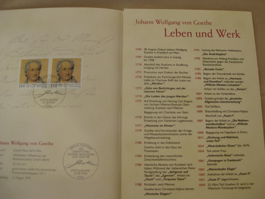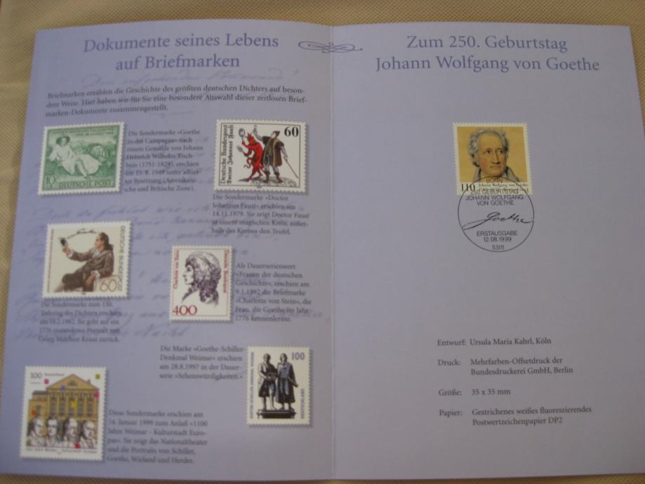 5) 12.08.1999: 250. Geburtstag Johann Wolfgang von Goethe, Mi br: 2073,