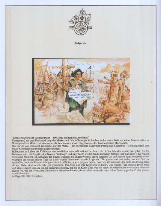 Bugarska – blok “500 godina otkrića Amerike”, Kristofor Kolumbo, luksuzni blok (1992)