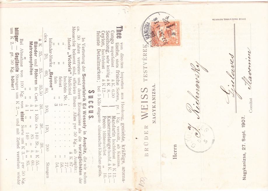 Dokument pismo putovalo iz Nagykanizsa u Gjulaves 1907