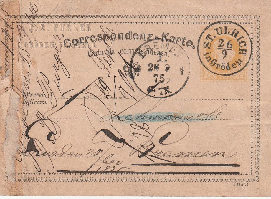 DOPISNICA AUSTRIA PUTOVALA IZ GRODENA U BREMEN 1875