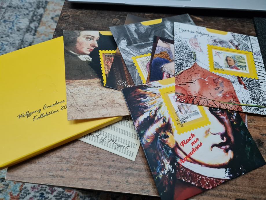 Komplet W.A. Mozart, 7 spomen kartona s markama i CD, ušćuvano, sve s fotografije..