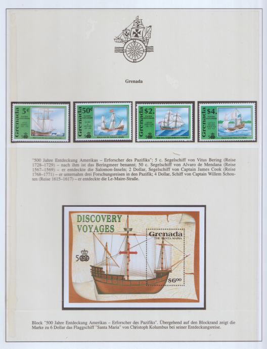 Kolekcionarski filatelistički list iz Grenade izdan povodom 500. obljetnice otkrića Amerike (1492–1992).