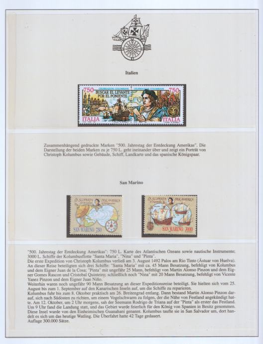 Kolekcionarski filatelistički list s izdanjima Italije i San Marina povodom 500. obljetnice otkrića Amerike (1492–1992).