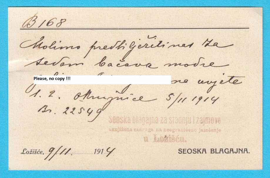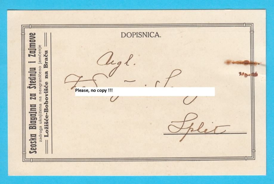 LOŽIŠĆA - BOBOVIŠĆA Seoska blagajna (Otok Brač) dopisnica putov. 1914.
