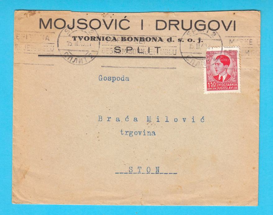 Staro zanimljivo pismo (omotnica) Tvornice bonbona Mojsović i Drugovi iz Splita poslano 1940-te godine u Ston, ondašnjim poznatm trgovcima Braći Milović.