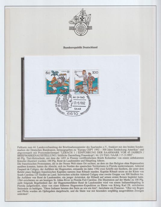 Njemačka (Saar) – EUROPA CEPT 1992 “500 godina otkrića Amerike”, FDC