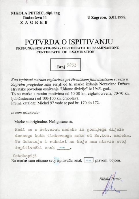 UDARNA DIVIZIJA ČETVERAC NDH 1945 WWII 170-172 ATESTIRANO RRR