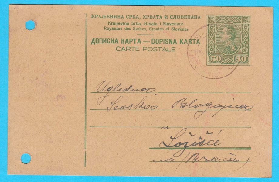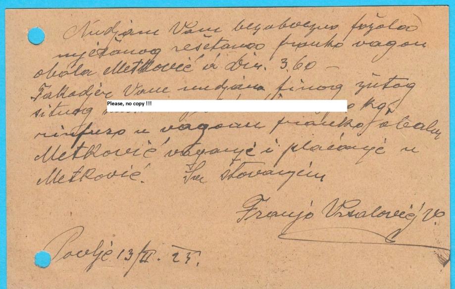 Stara predratna dopisnica, poslana 1924. godine od gosp. Franjo Vrsalović iz Povlja (Povlje) u Ložišća (Ložišće) na otoku Braču.