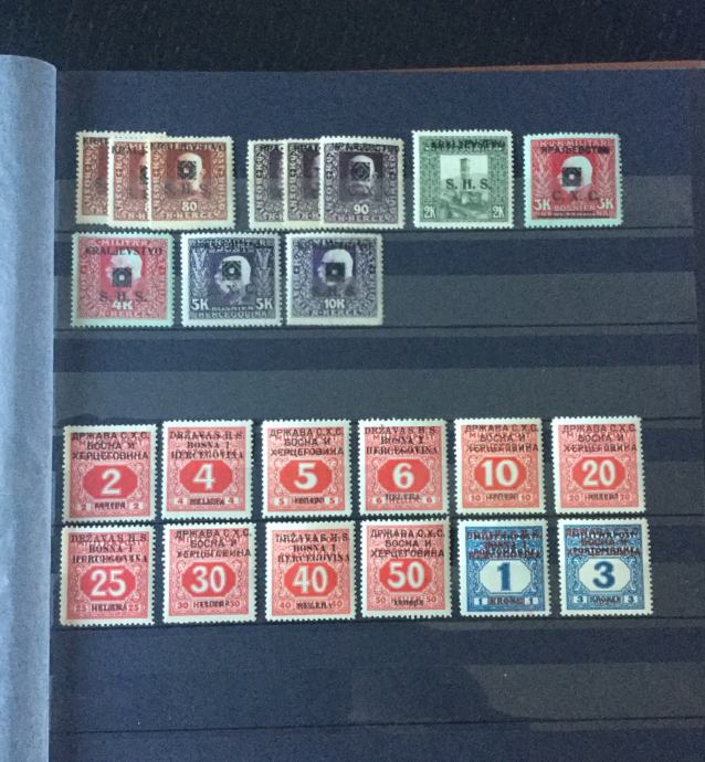 SHS Bosna i Hercegovina, nerabljeno, prema Strpiću 1-16 tragovi falca/MNH, 17-18 MNH, 21-22 MH/MNH, 32-39 i 41-49 MNH (marka 49. od 10 kruna ima oštećeno zupčanje-vidi se na slici), porto 1-5 i 7-13 MNH + lot rabljenih maraka, sve na slikama.