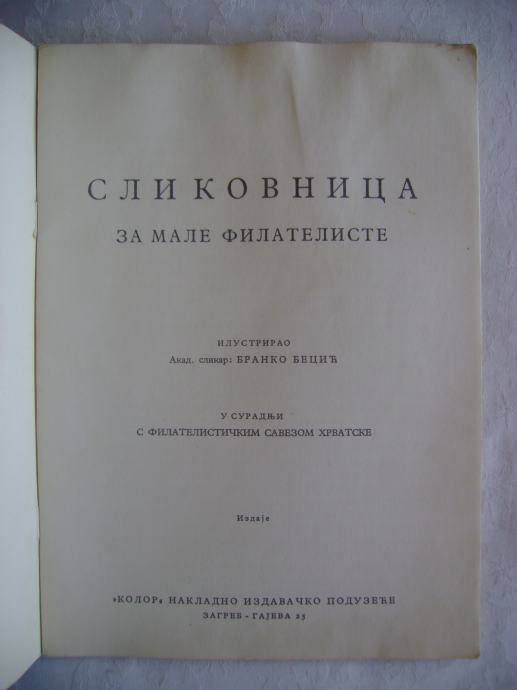 Slikovnica za male filateliste - izdavač Kolor, Zagreb 50-ih godina, 17 x 23 cm, meki uvez, 32 stranice, ilustrirao akademski slikar Branko Becić, tekst je na ćirilici.