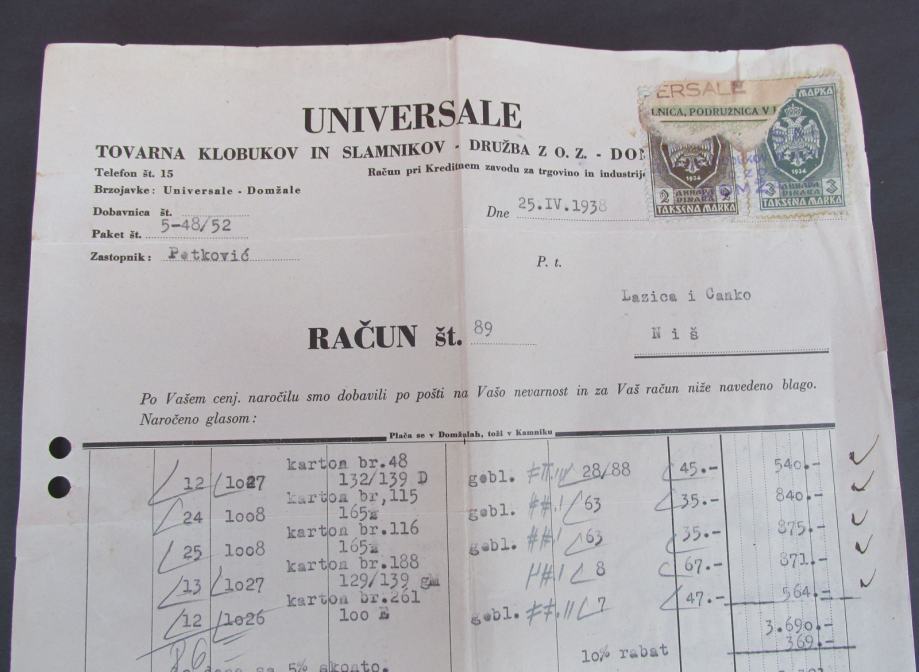 TOVARNA KLOBUKOV DOMŽALE SLOVENIA 1938. MEMORANDUM RAČUN