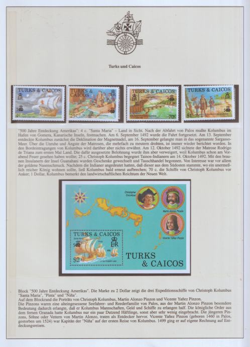 Turks & Caicos – Columbus 1492 Discovery, set + blok (Santa Maria, Pinzón, 500 Years America)