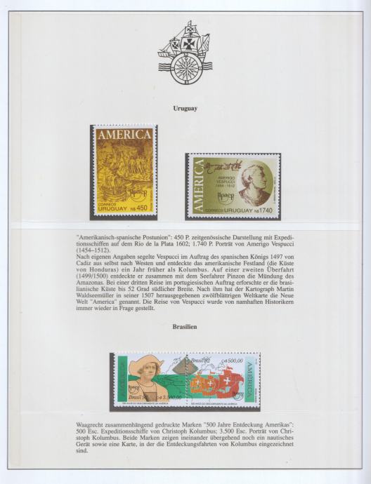 Filatelistički list s markama Urugvaja i Brazila izdan povodom 500. obljetnice otkrića Amerike (1492–1992).