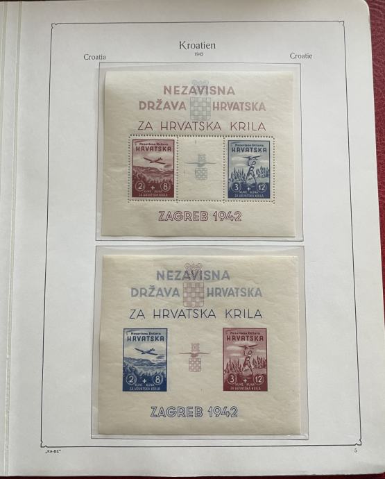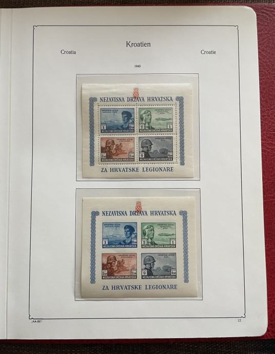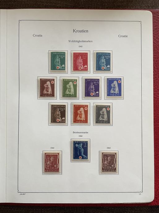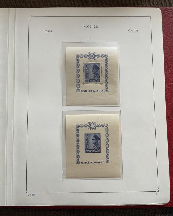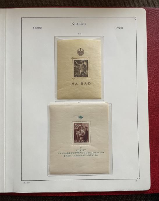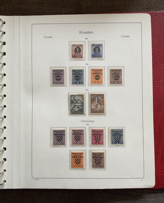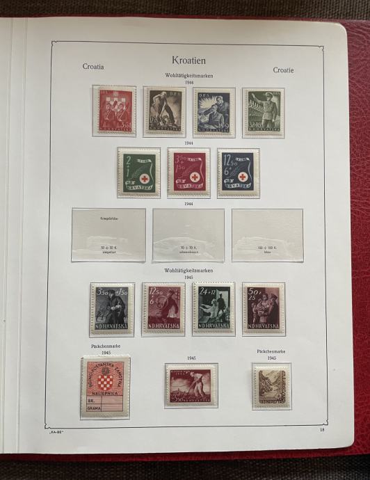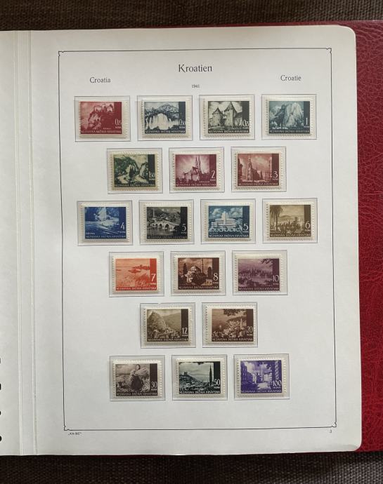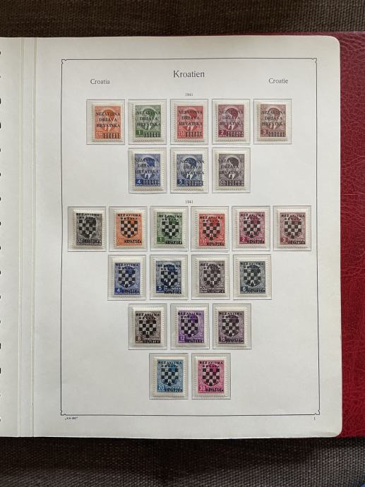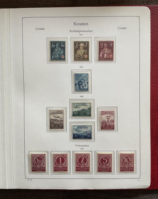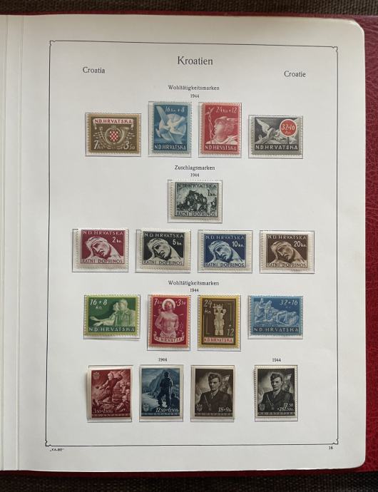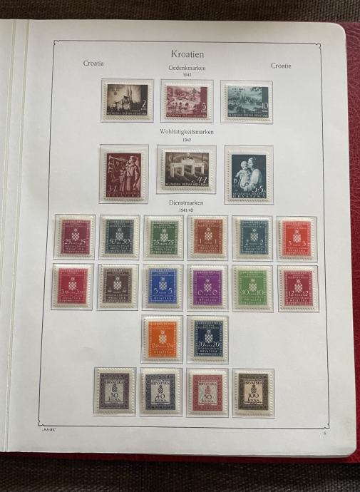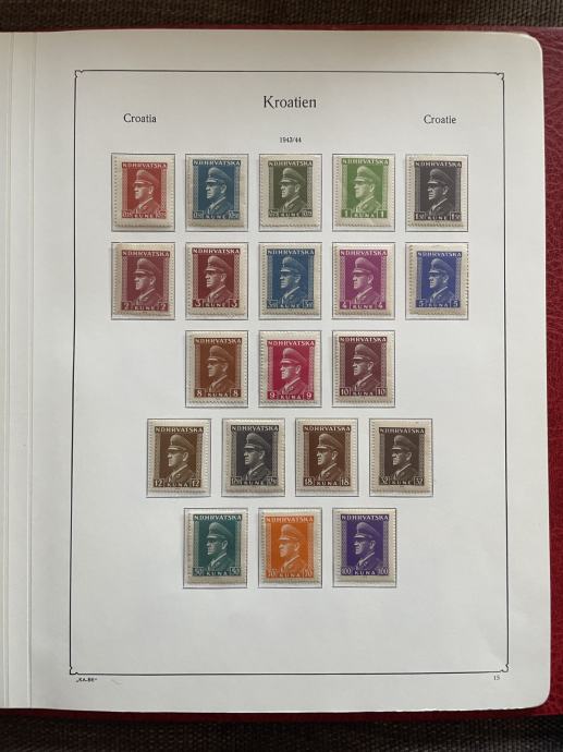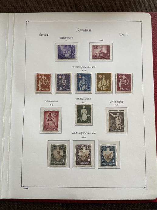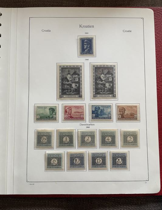 Zbirka maraka Hrvatske 1941-1945 tzv. “mala ndhazija”u albumu na KA-BE listovima. Sve marke su MNH. U zbirci nema jubilarne serije, serije udarna divizija i bloka udarna divizija. Blok “Stari Dolac” i marka “Hrvatsko more” su sa oznakom gravera “S”. U albumu su i listovi za jubilarnu serije i blok udarne divizije ali nisu u oglasu zbog ograničenog broja slika.091/6550922. Sve u super stanju.