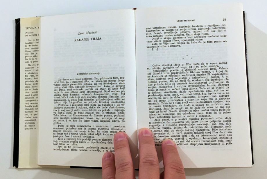 Autori tekstova: Arnheim, Astruc, Balazs, Barthes, Bazin, Burch, Zavattini, Delluc, Deren, Dulac, Ayfre, Eisenstein, Eco, Epstein, Faure, Canudo, Cohen-Seat, Comolli, Kracauer, Kulesov, Leger, Malraux, Marinetti, Mekas, Metz, Munsterberg, Mitry, Morin, Moussinac, Panofsky, Pasolini, Pudovkin, Richter, Spottiswoode, Oudart, Vertov (Kaufman), Vigo, Vorkapić.