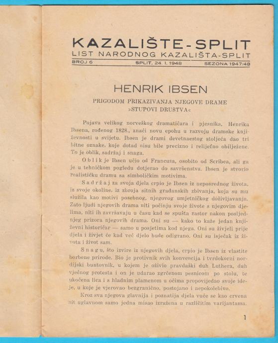 KAZALIŠTE SPLIT - List Narodnog Kazališta Split ... br.6 iz 1948. god.
